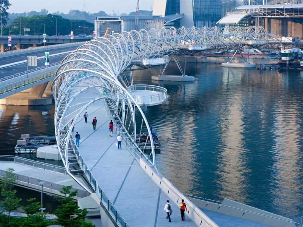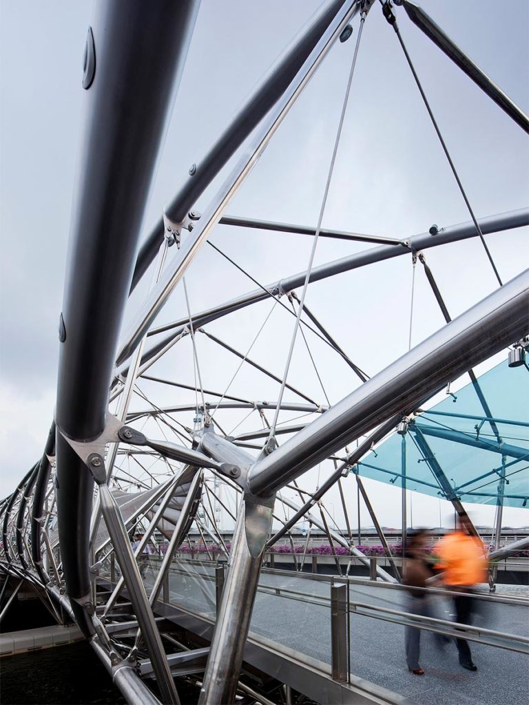 The Helix Bridge is named after the inspiration for its structure – the DNA molecule. Conceived by Arup engineer Tristram Carfrae, the structure solved the problem of a need to curve the bridge in plan and form a circle in section, the latter as a way of integrated deck and canopy. So inherently stable the DNA structure proved, it made a substantial saving in material than a conventional bridge, and the client decided to fabricate it in stainless steel. This enabled fine detailing of the segments and connections, and insertion of LED dot lights that accentuate the spirals at night. The structure comprises two continuous spirals running counter to each other. They are connected by thin struts which support alternated mesh and glass canopies, creating a dramatic atmosphere at night.