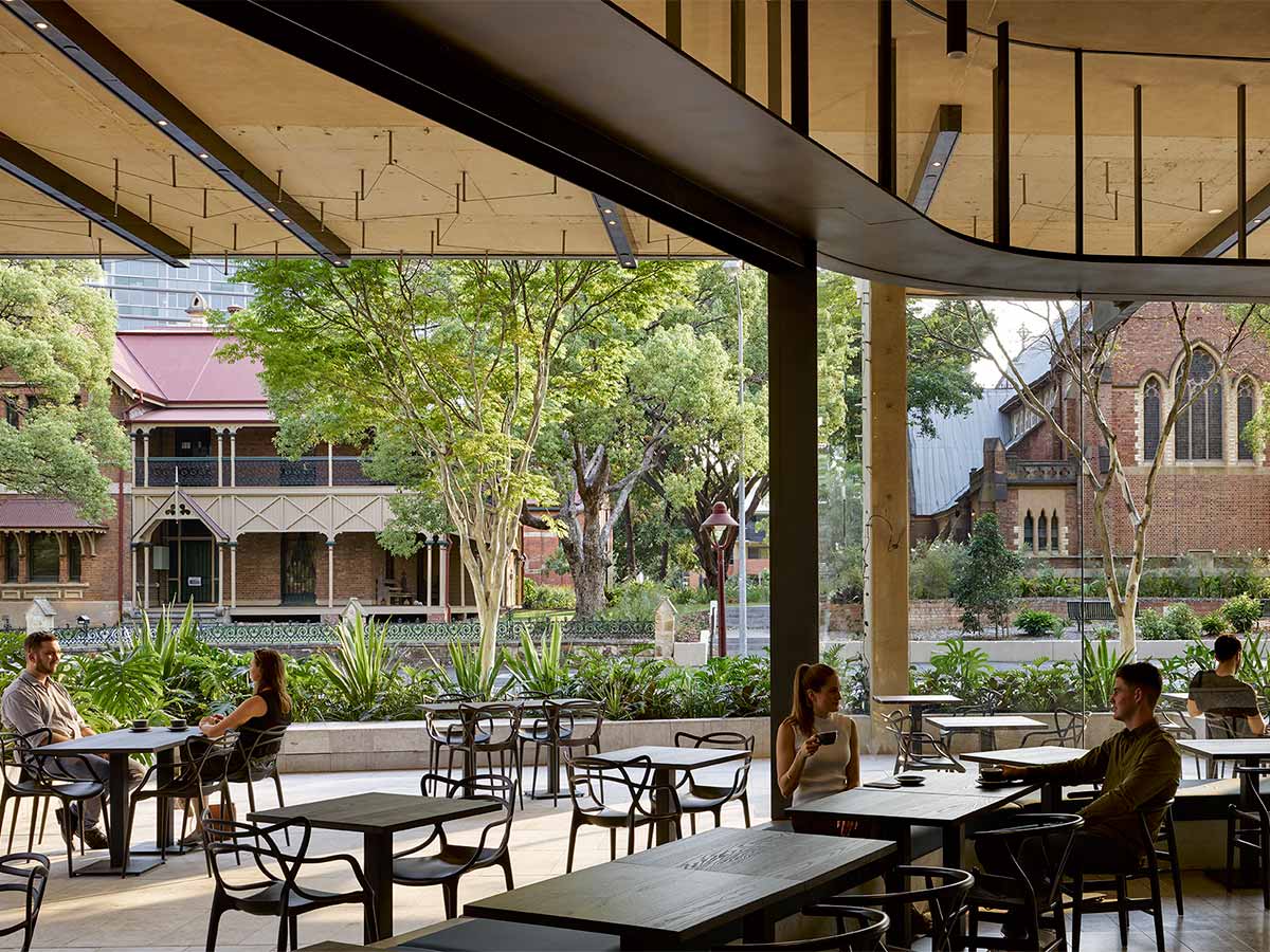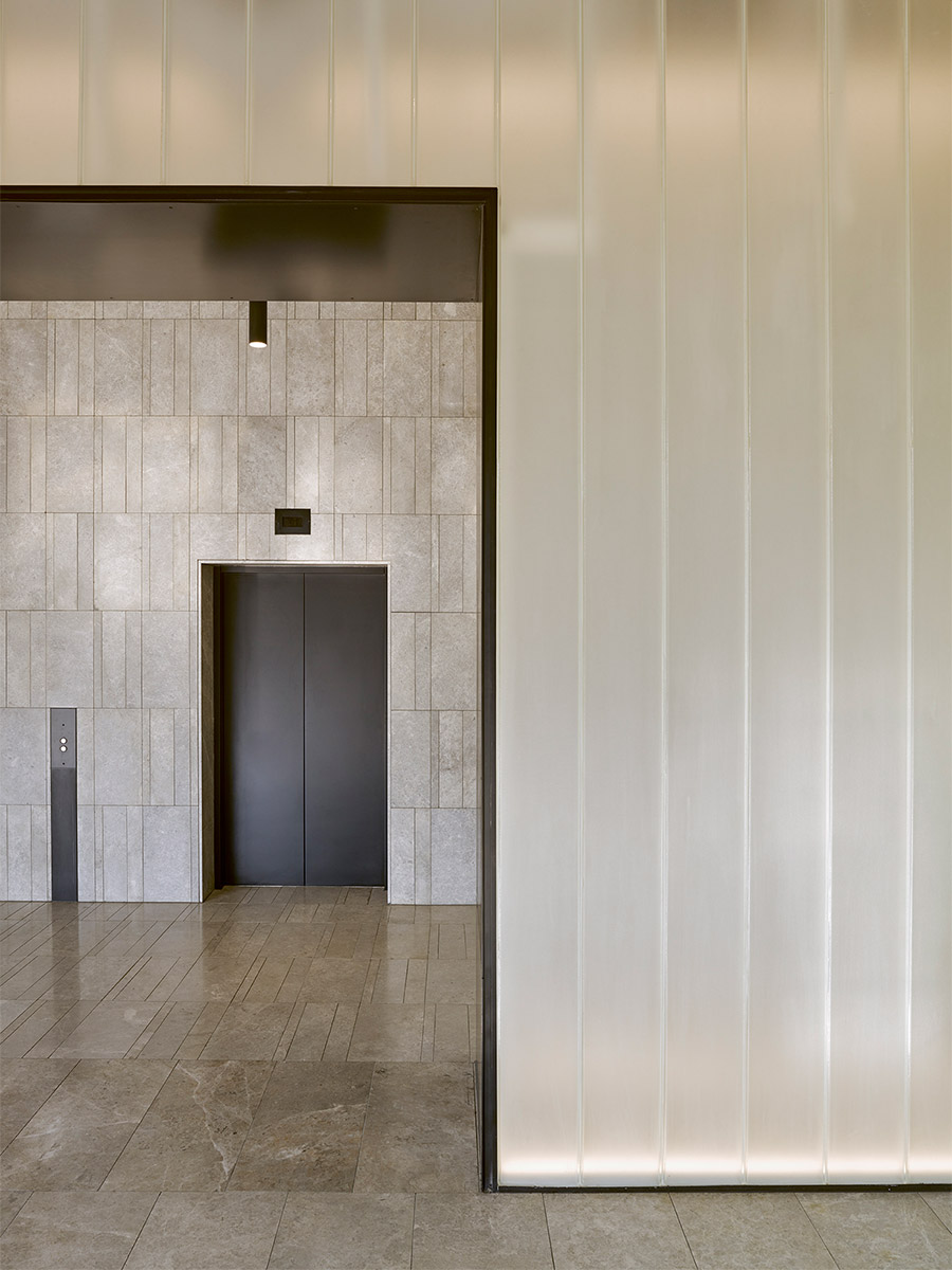 Materials are primarily natural, relating the spaces to the raw coloured-concrete building above with former suspended ceilings stripped off to allow the concrete to wrap under and form the canopy to the spaces. Subtle material and colour transitions along a profilit glass wall reinforce spatial continuity, with bespoke detailing removing the previously corporatised identity, encouraging people to regard the space as openly public.