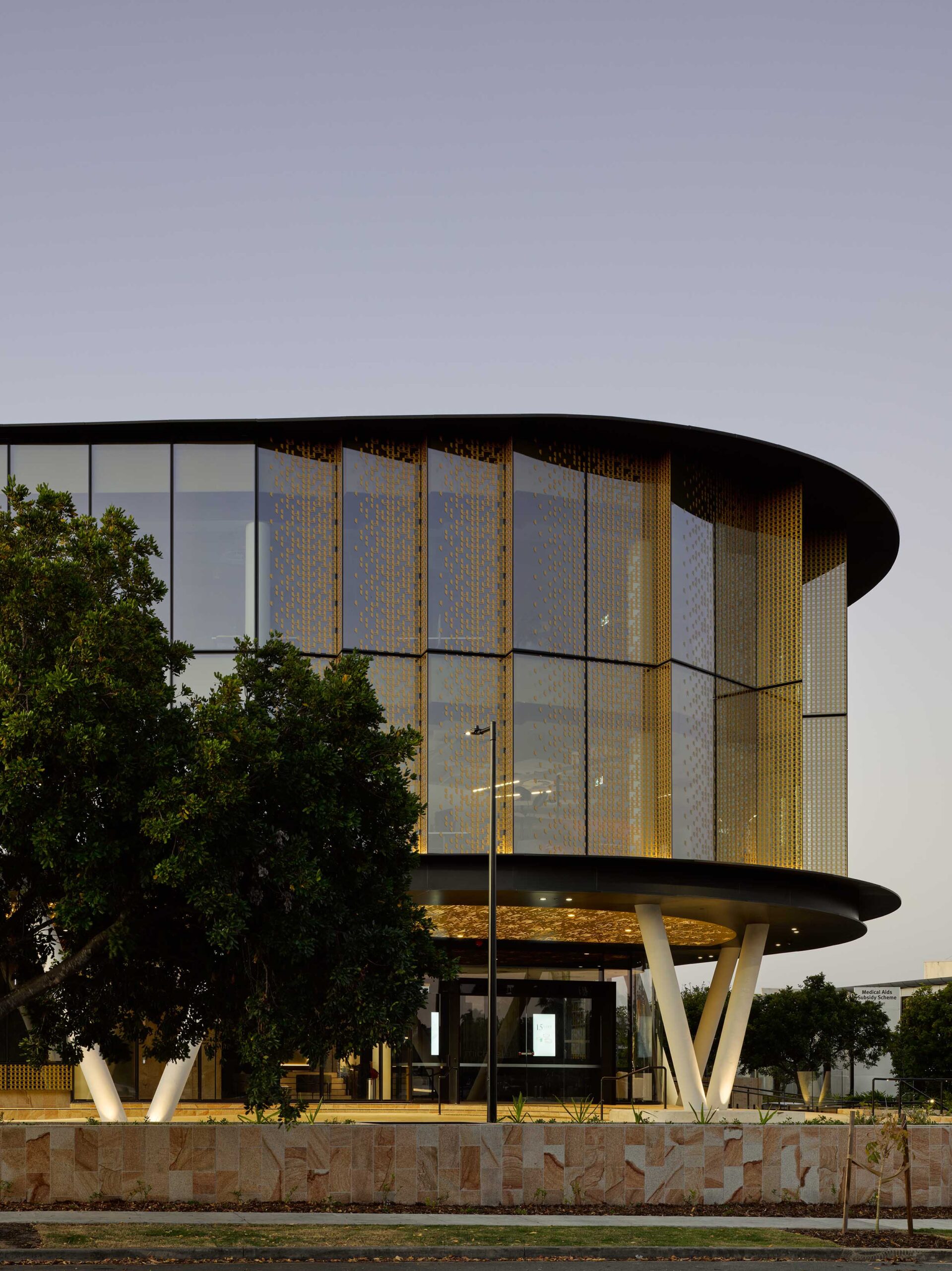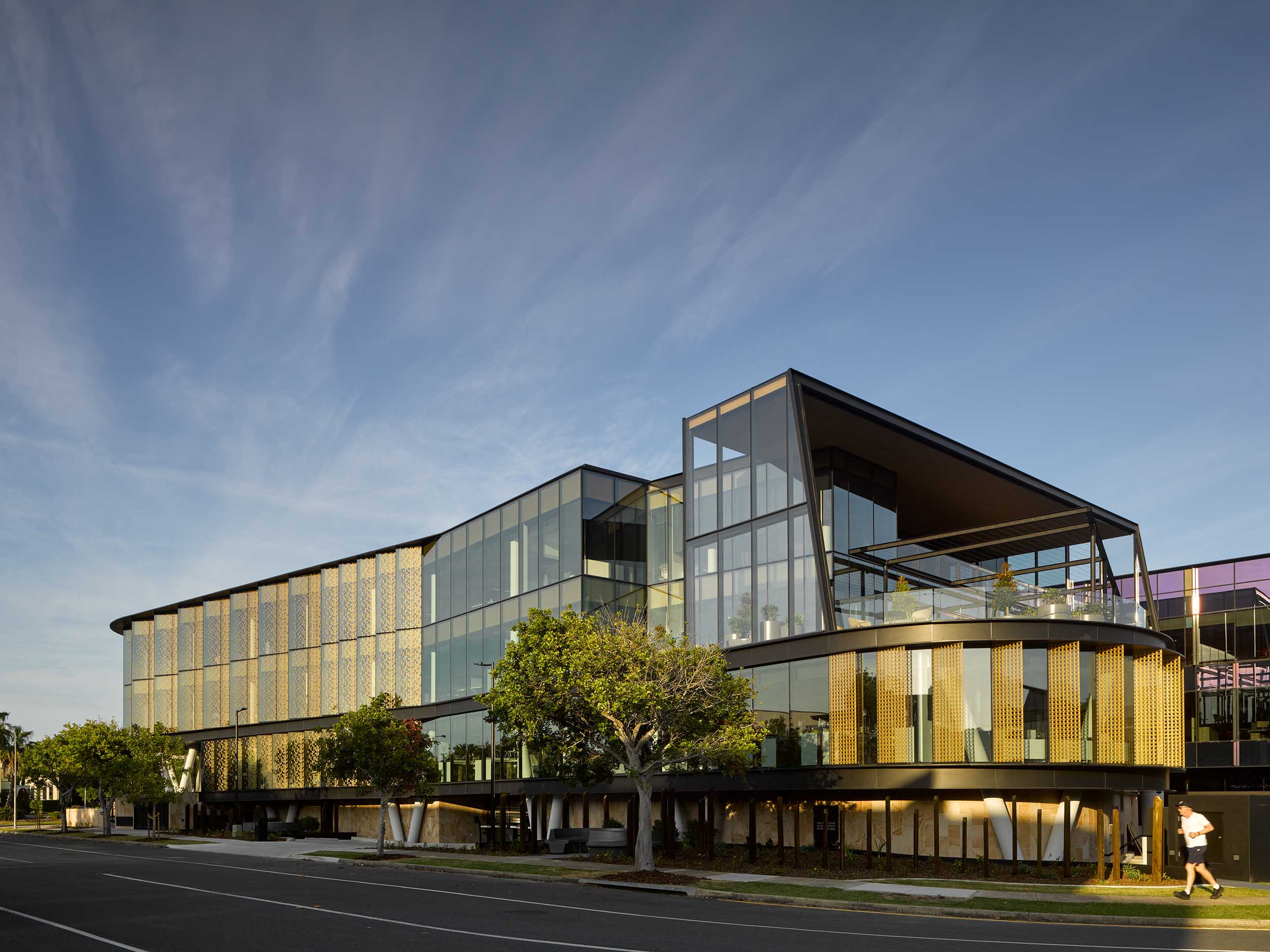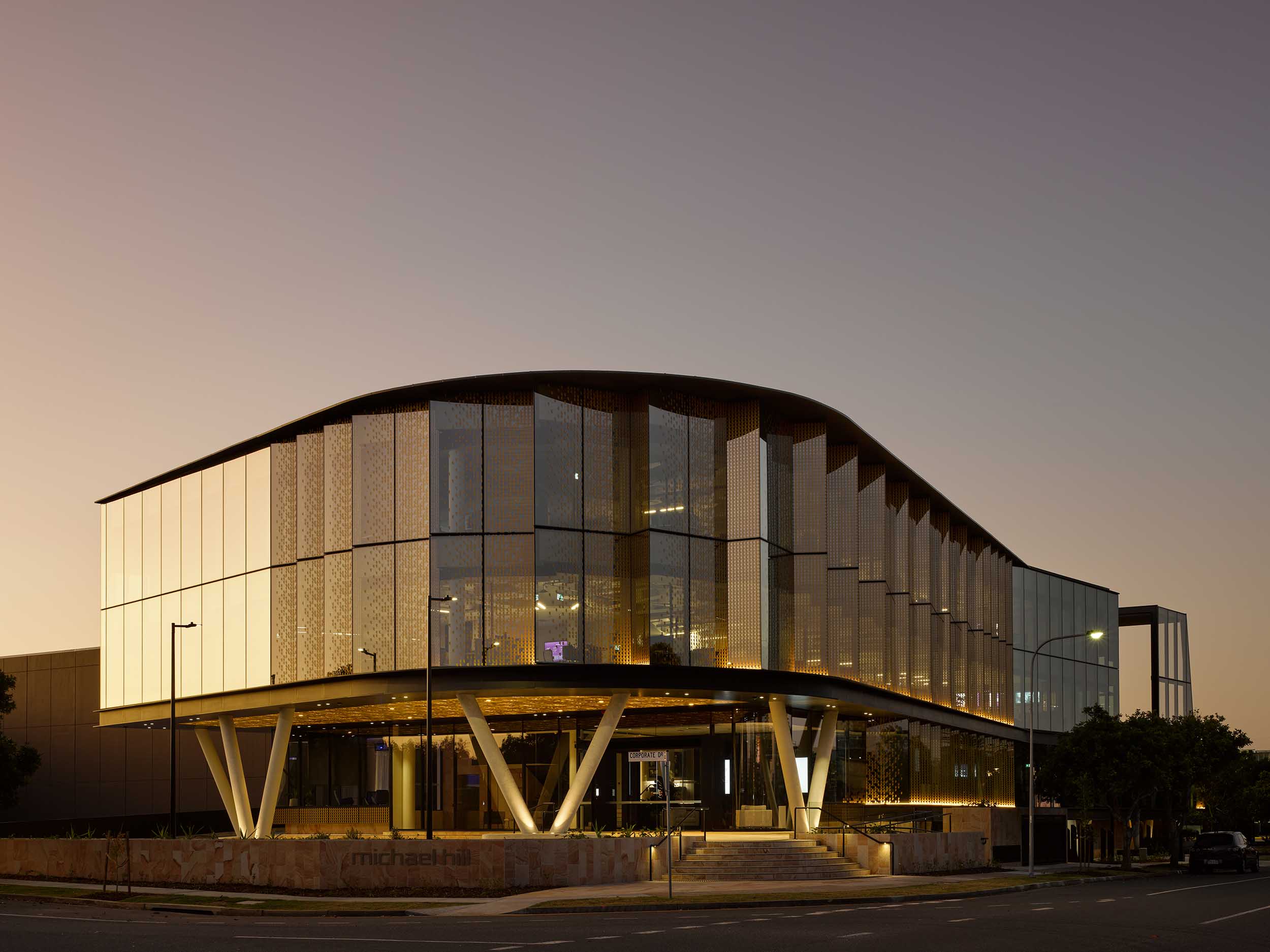 The design of this three level building is conceived to portray a jewel-like character, reflective of the building user. Its curved façade defines the arrival into a larger office park precinct, with staggered and patterned façade segments creating a bracelet effect.