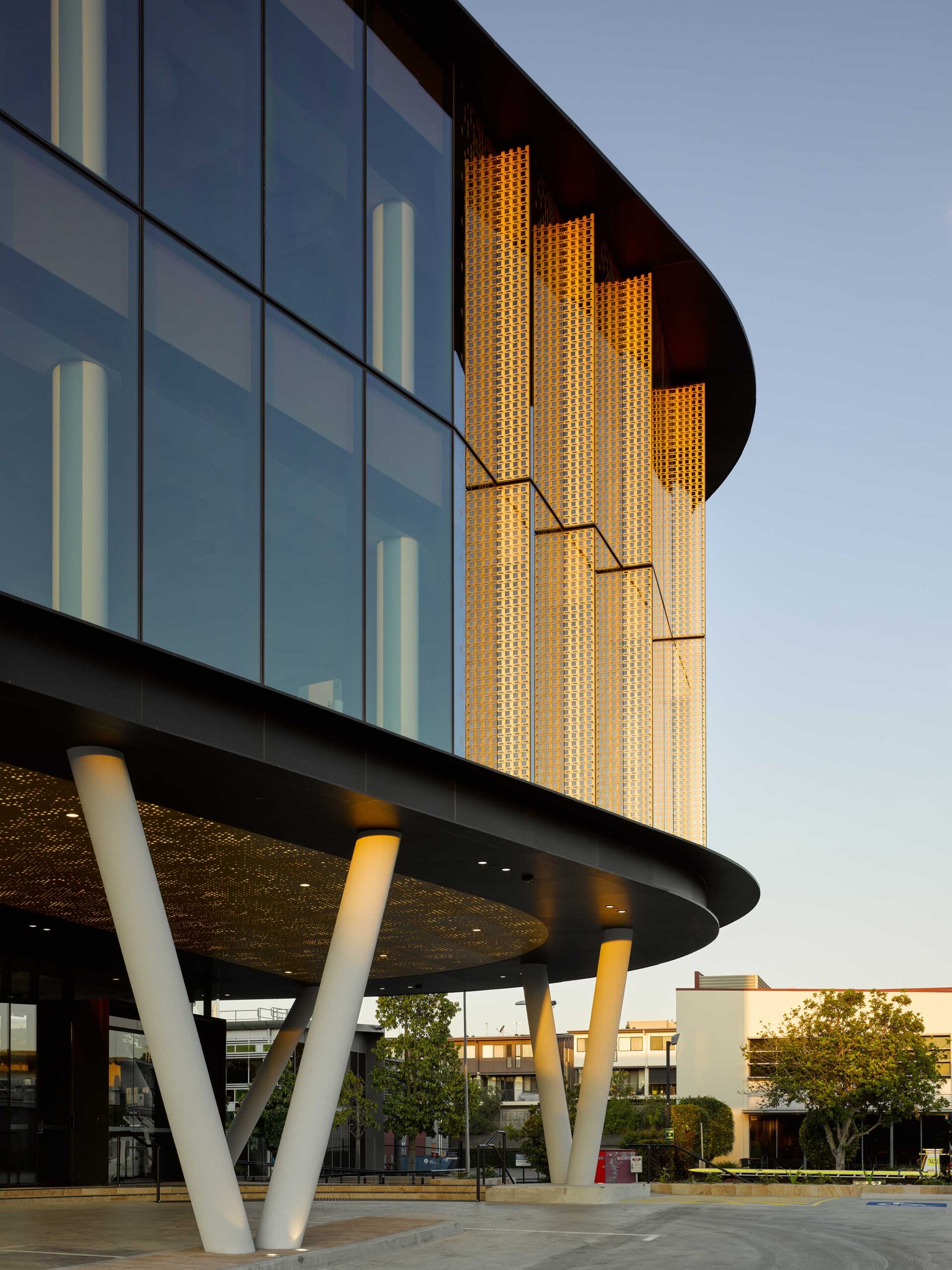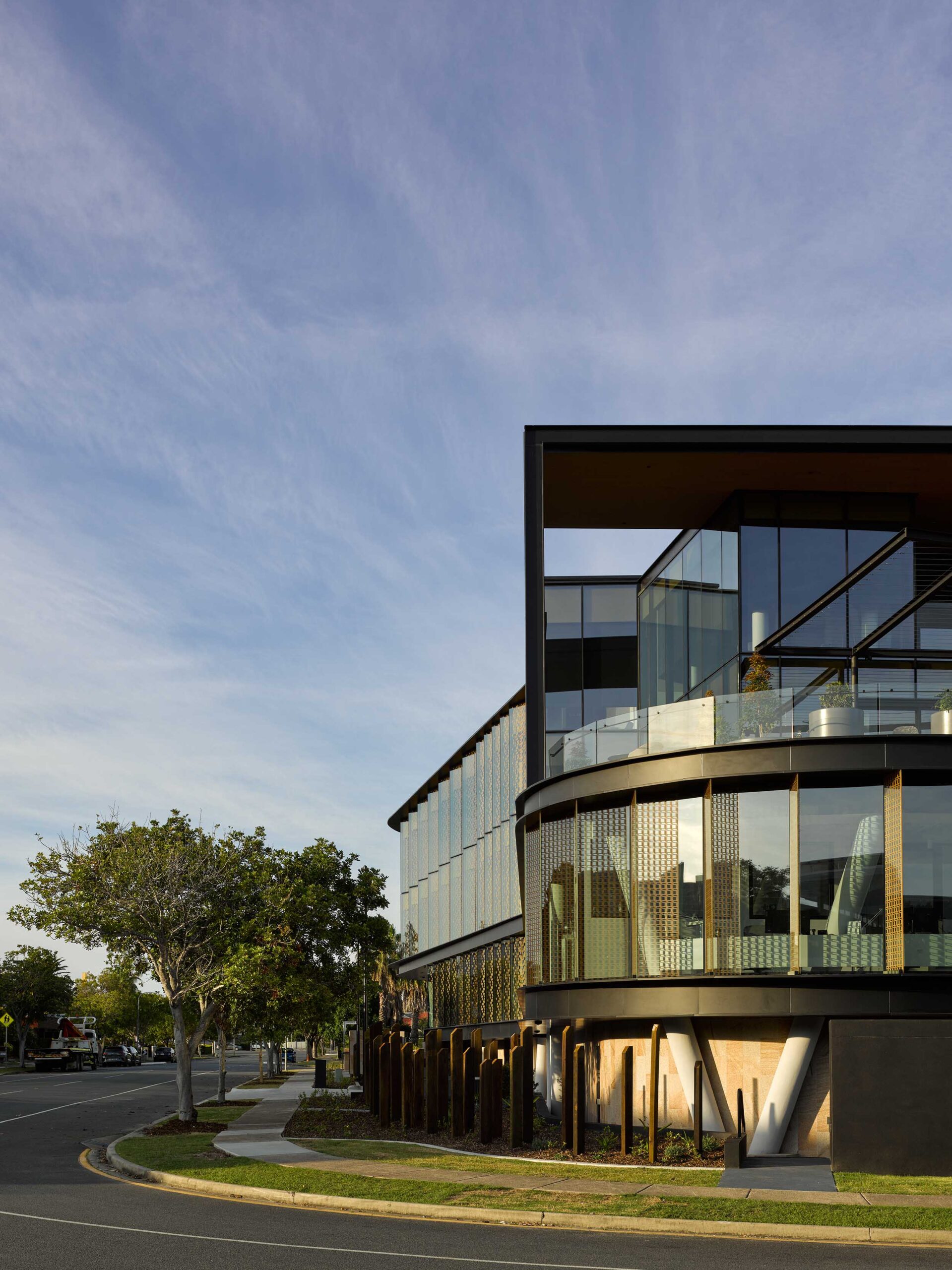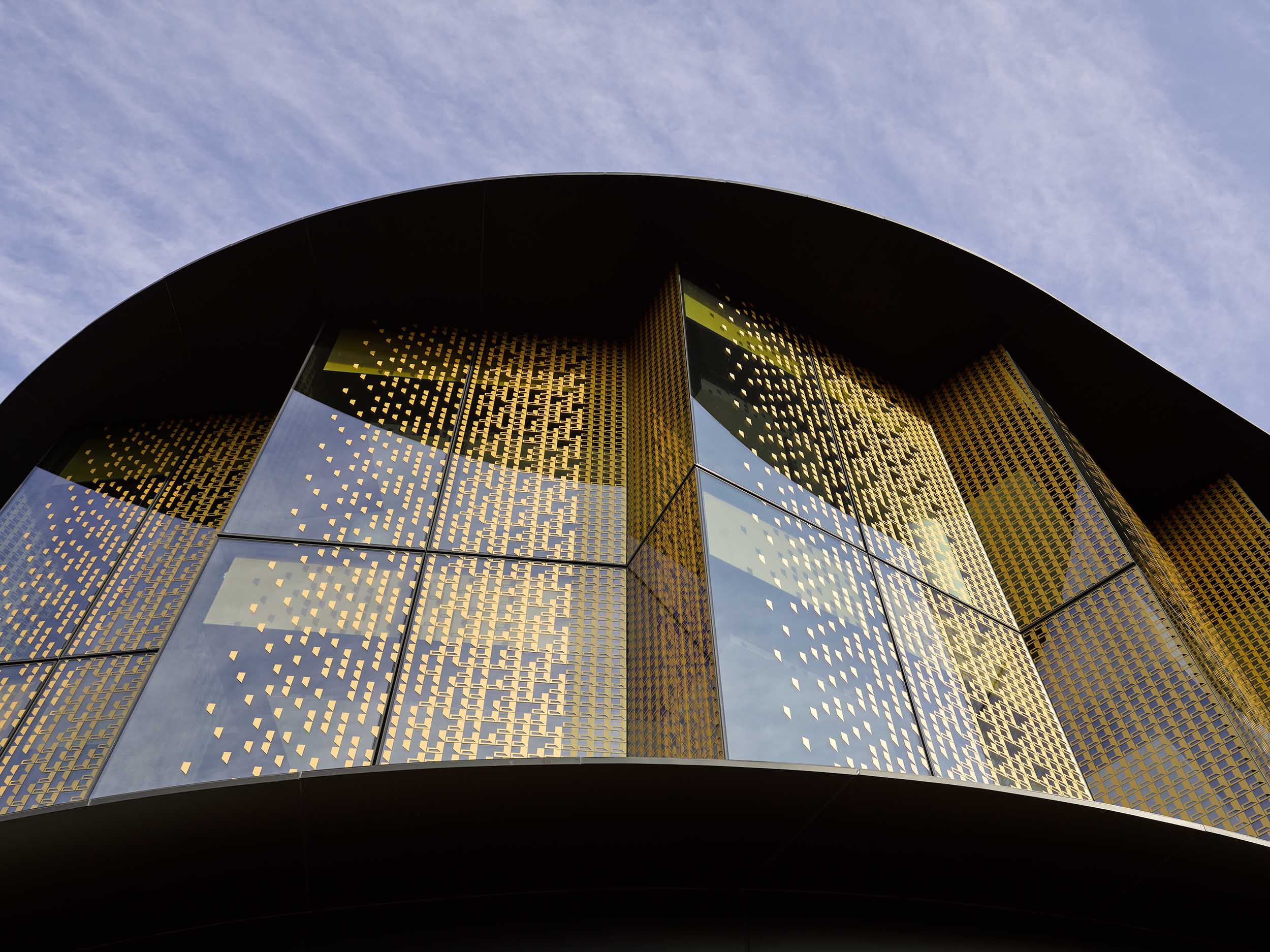 The design of this three level building is conceived to portray a jewel-like character, reflective of the building user. Its curved façade defines the arrival into a larger office park precinct, with staggered and patterned façade segments creating a bracelet effect.